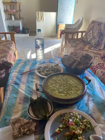 Alsof het al niet warm genoeg was midden in het Rifgebergte kon hij, na vernomen te hebben dat we met de gehele vrijwilligersgroep in Marokko waren, het niet laten om ons nog eens extra in het zonnetje te zetten. We waren met de gehele groep uitgenodigd bij hem thuis voor een heerlijke maaltijd. Waar wij vorige keer verwend werden met een smaakvolle vis, heeft hij ons dit keer verblijd met een heerlijke salade, Bisara en Marmita met kip.